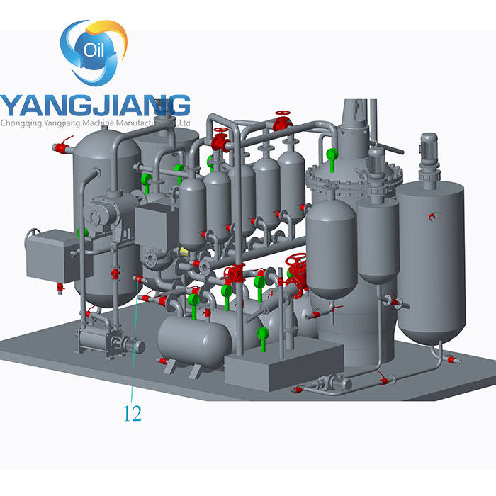 After years of unremitting efforts by the R & D team, Yangjiang has already possessed a complete and mature waste oil distillation technology. Vacuum distillation is the core waste oil regeneration technology. The regeneration and reduction system produced by Yangjiang uses batch processing to treat pretreated waste oil, that is, by natural sedimentation, or by using centrifuges to remove water and magazines. After entering the catalyst reaction tank, stir the reaction thoroughly. The fully reacted waste oil is pumped into a distillation kettle, and the waste engine oil is heated under vacuum. As the temperature rises, the oil and gas of different components will evaporate. After cooling, the corresponding fuel oil, light base oil and heavy base oil can be obtained. The liquefiable part can be reused. The non-liquefiable part enters the heating system for combustion through the gas system without wasting any resources.